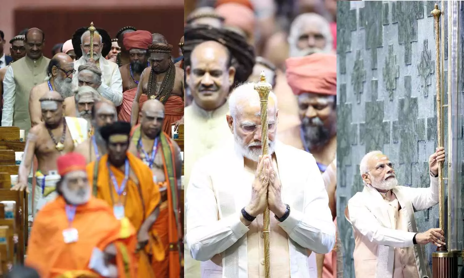 PM Modi installs the historic 'Sengol' near the Lok Sabha Speaker's chair in the new Parliament building