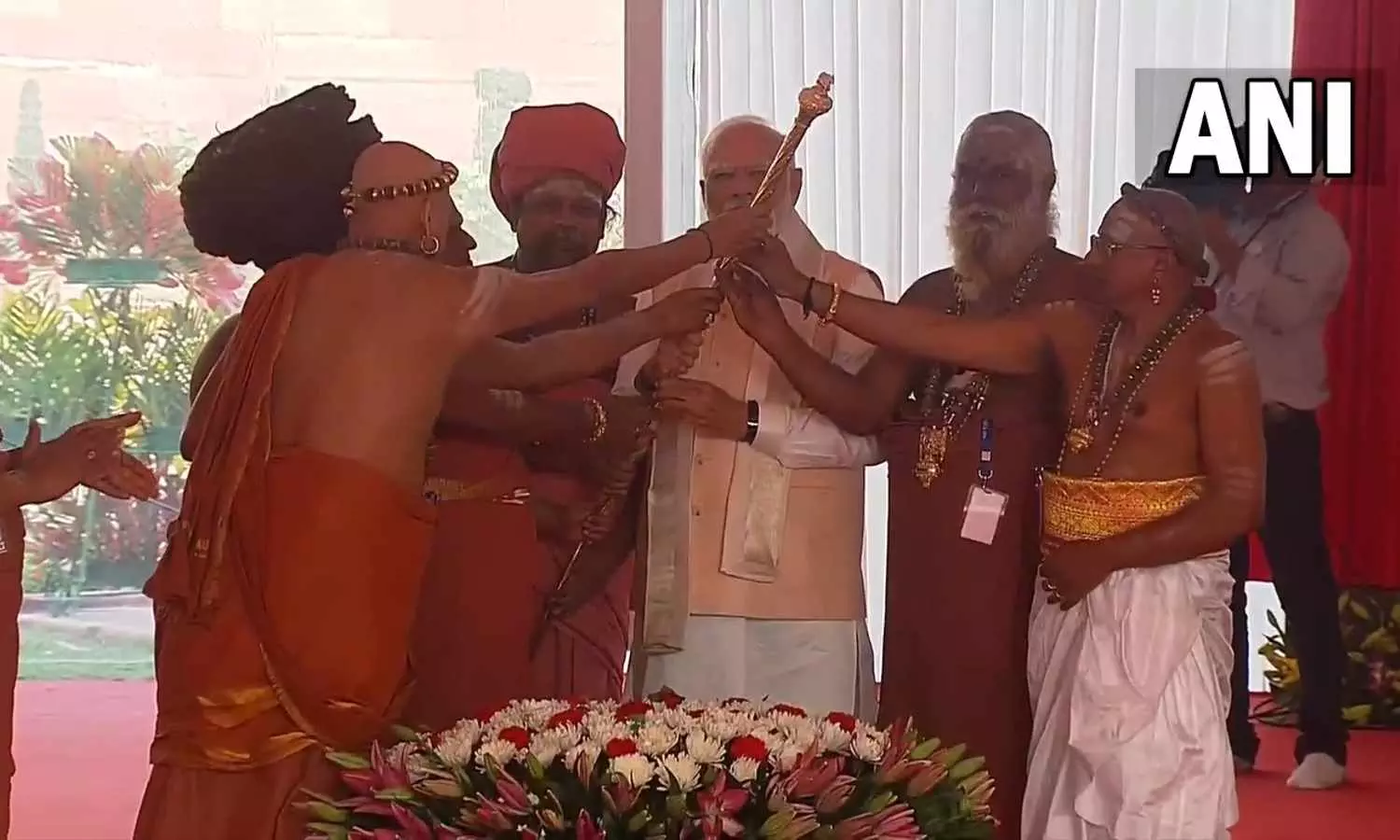 PM Modi handed over the historic 'Sengol' by Adheenams before its installed in the new Parliament building