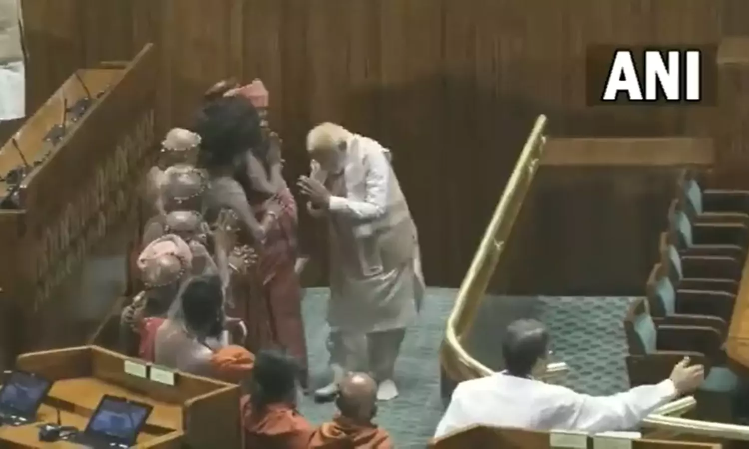 PM Modi receives blessings of seers of different Adheenams from Tamil Nadu after the installation of the 'Sengol' in the new Parliament building in Delhi
