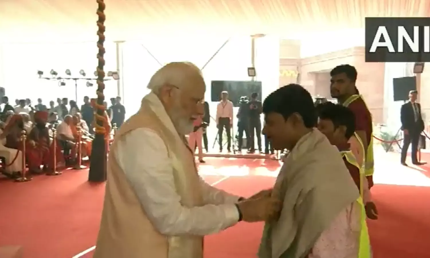 PM Narendra Modi felicitates the workers who helped in the building and development of the new Parliament House.