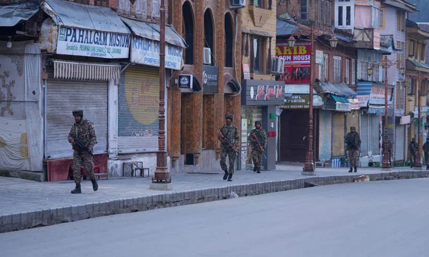 Security officers patrol a shopping area in Pahalgam (Photo: AP)