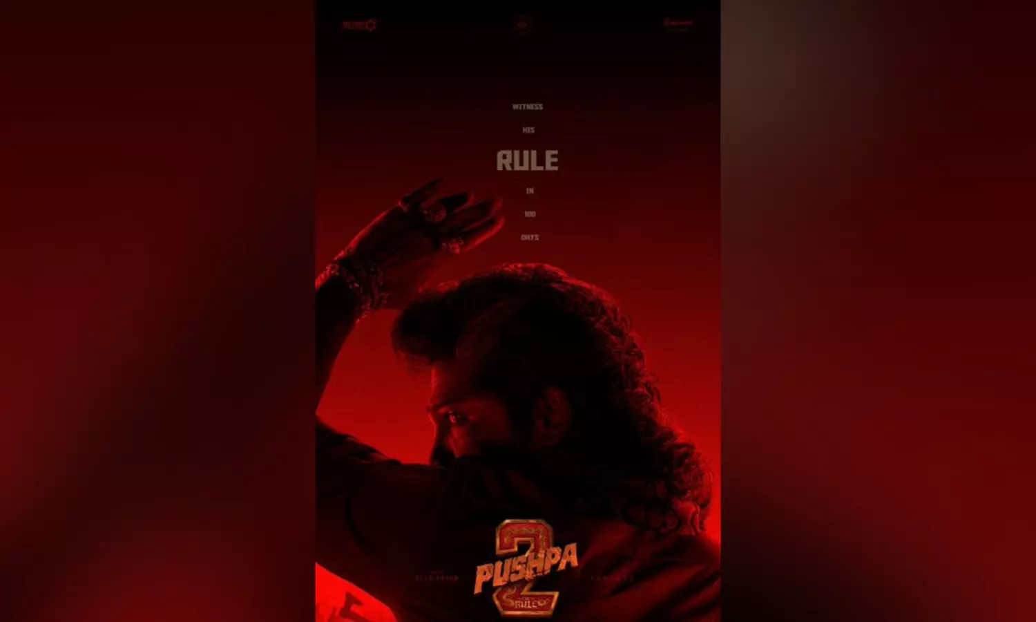 The poster, featuring Allu Arjun’s iconic character Pushpa Raj against a striking red backdrop, comes with the tagline “Witness his rule in 100 days,” signaling the film’s much-awaited release.