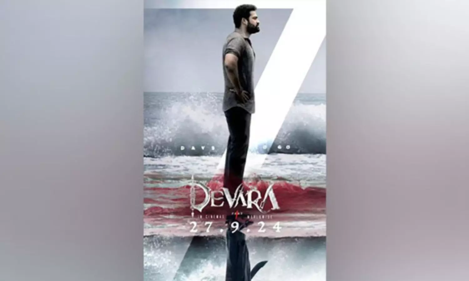 Jr NTR looks intense as he can be seen looking away from the camera while he stands near a sea with blood around him. "Prepare to sail into the depths of fear in all its glory. The sea tells tales of blood and courage on 27.09.24," post read.