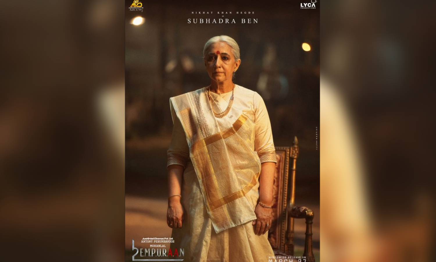 "Character No: 14 Presenting Nikhat Khan Hegde as Subhadra Ben in #L2E. The rise of #Empuraan continues! #L2E Releasing on 27th March 2025 | Malayalam | Tamil | Telugu | Kannada | Hindi @mohanlal @PrithviOfficial #MuraliGopy @LycaProductions #Subaskaran @gkmtamilkumaran