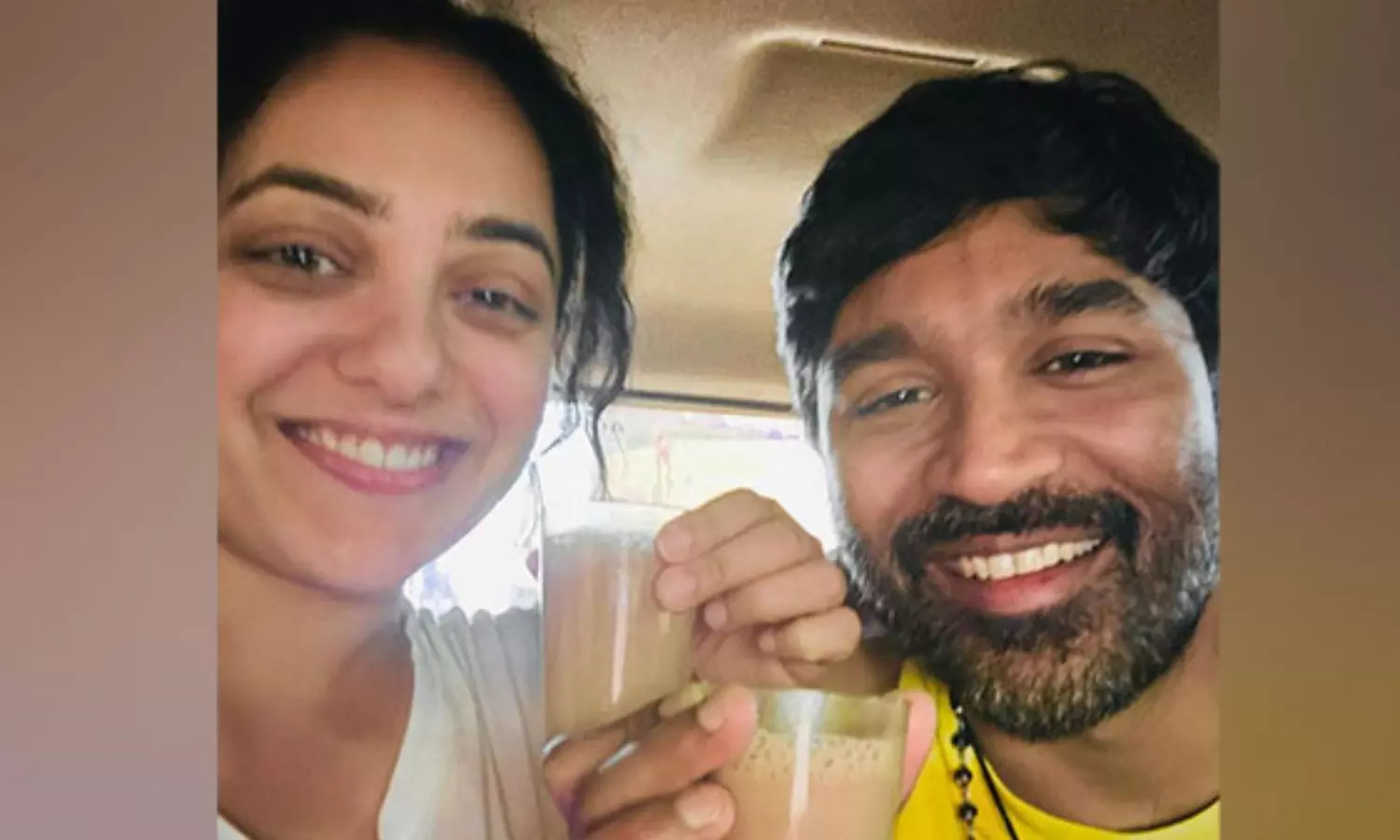 In the picture, Nithya is seen in a white T-shirt while Dhanush is wearing a yellow one, both smiling and holding glasses of tea.