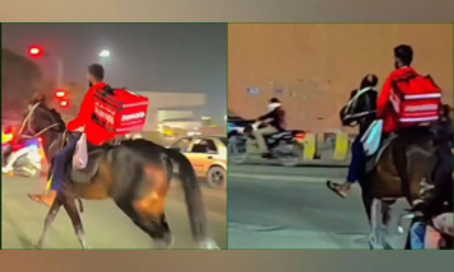 HYDERABAD: A delivery boy of Zomato took a horse ride to deliver an order in Hyderabad on Tuesday after petrol stations ran out of fuel due to strike by truckers over new law on hit-and-run accidents.