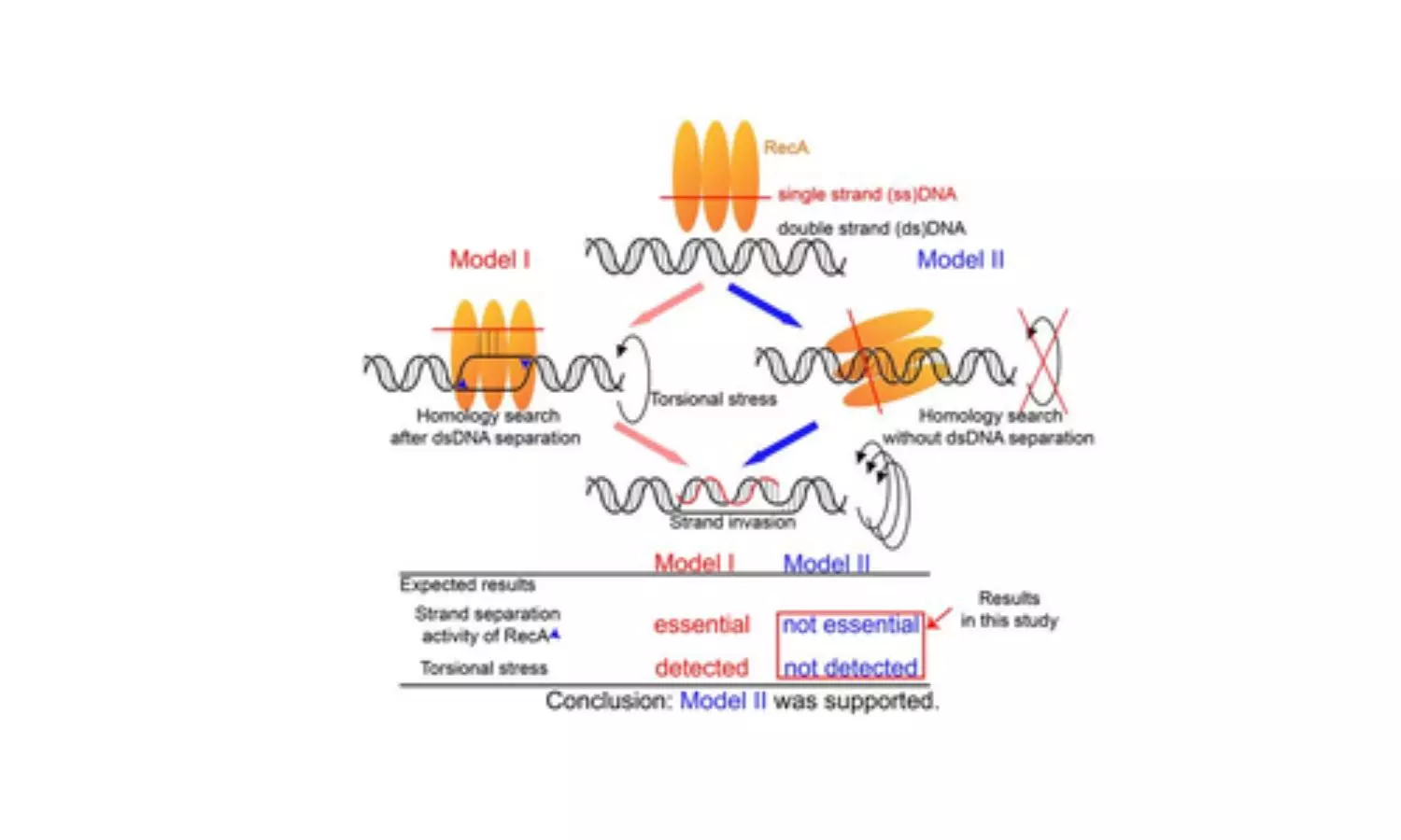 In one, RecA unwinds a section of the double strand during the “homology search,” where it tries to find the right place for strand invasion to occur. In the second, there is no unwinding after the binding of RecA; only when strand invasion takes place does any unwinding occur.