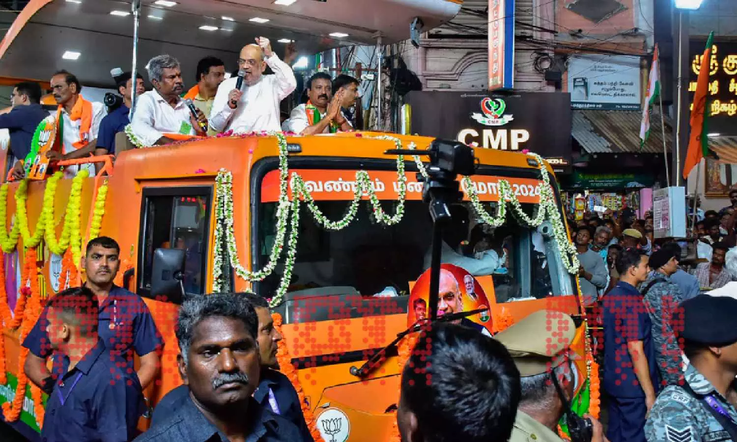 Shah greeted the cadres from his specially-designed vehicle and flashed the party’s Lotus symbol throughout the stretch, as party members chanted “Modi again”, “Bharat Mata Ki Jai” and “Ponnar again.” Radhakrishnan, a former union minister, is fondly addressed as Ponnar by supporters.