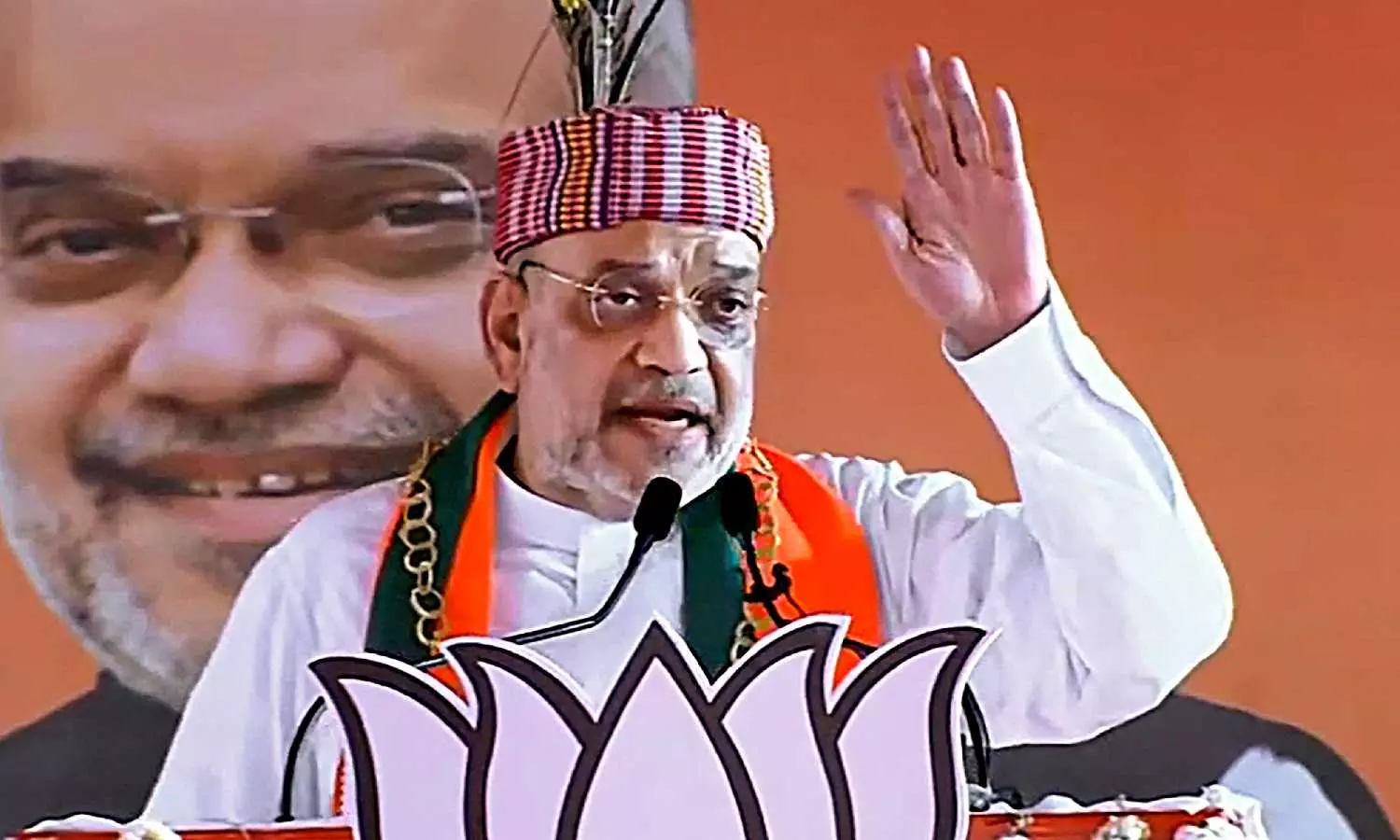 Amit Shah during a public meeting ahead of Lok Sabha elections in Mandla. (PTI)