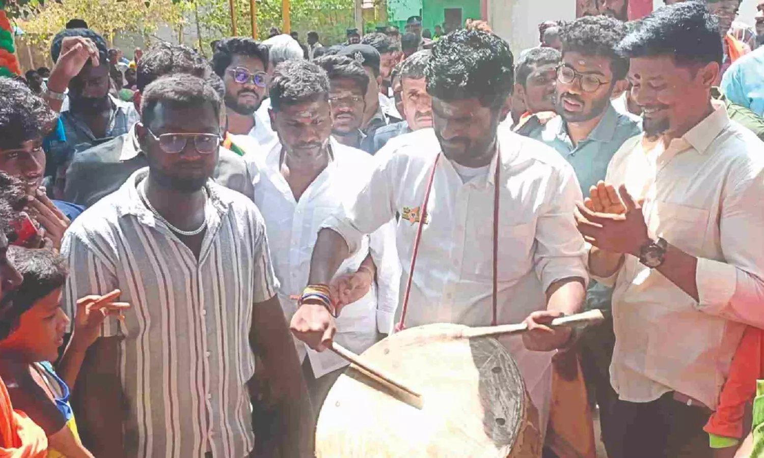 BJP state president K Annamalai beating drums while campaigning to seek votes in Coimbatore on Sunday