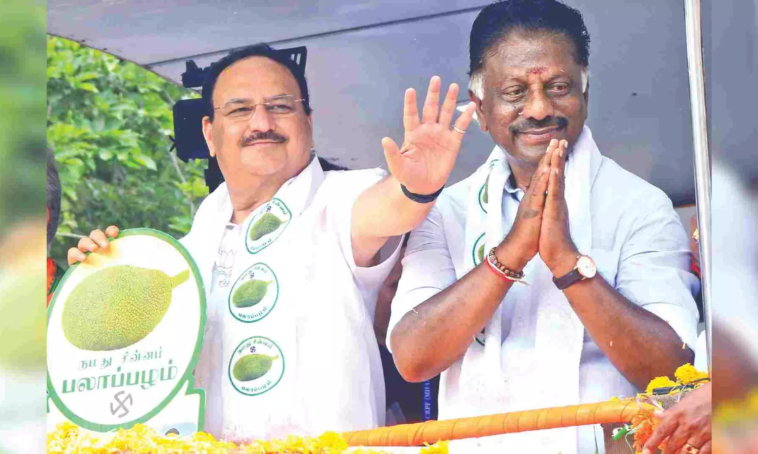 BJP national president JP Nadda with O Panneerselvam during a roadshow in Paramakudi, Ramnad on Tuesday (Photo: Sethu)