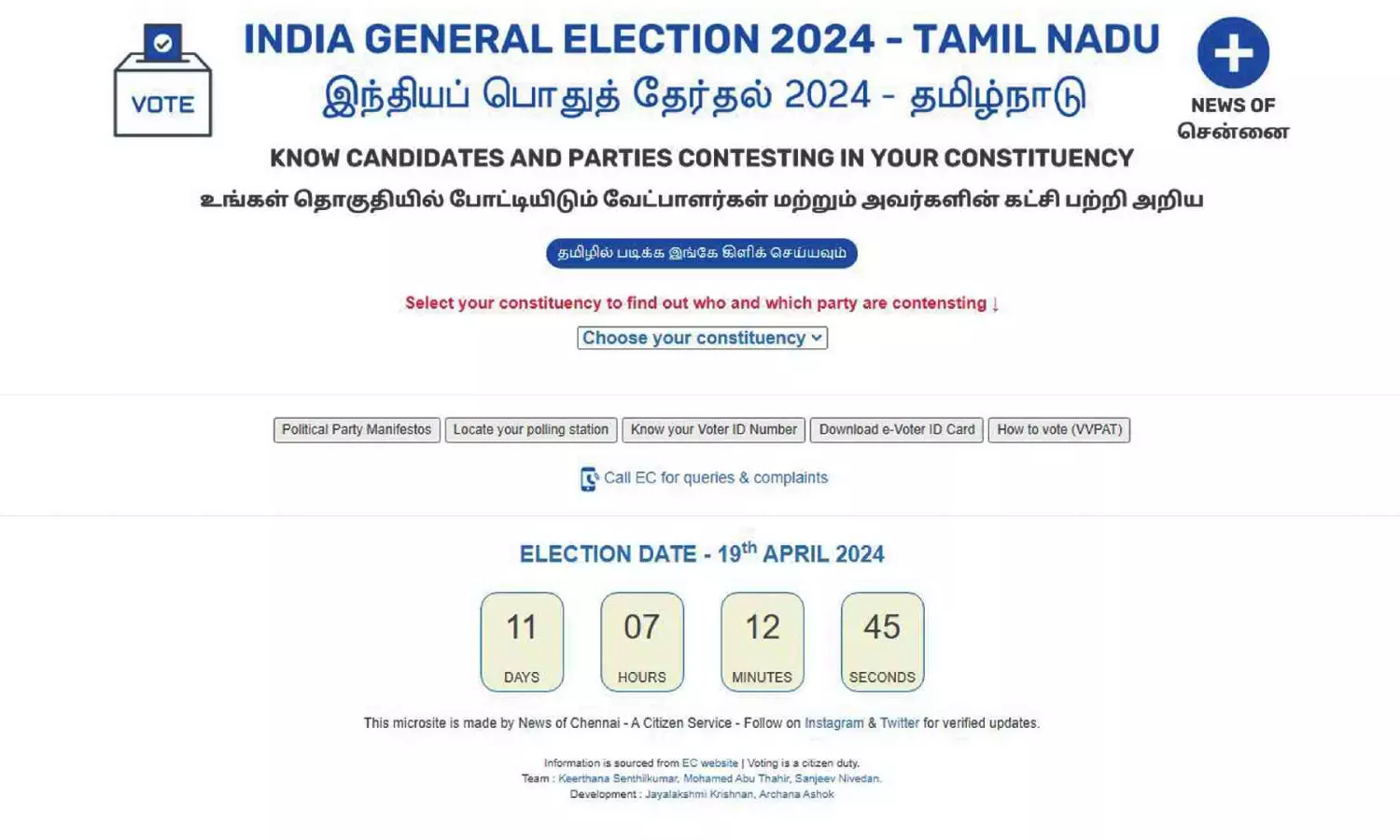 CHENNAI: News of Chennai, an online citizen service initiative that provides credible and verified information when needed, has launched its latest project. As part of their commitment to promoting informed citizen engagement, the team has created a micro-website - tnelection2024.in - aimed at empowering voters across Tamil Nadu and Puducherry.