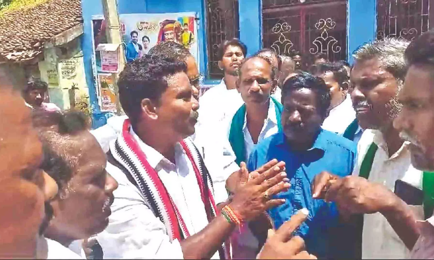 Protesting sugarcane farmers in an argument with the Mayiladuthurai AIADMK candidate P Babu