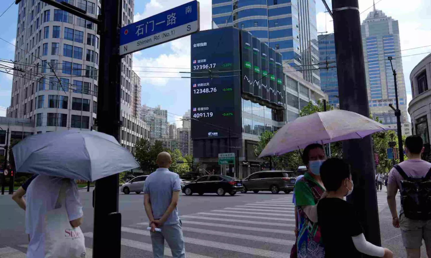 Pedestrians wait to cross a road at a junction near a giant display of stock indexes in Shanghai (Photo/Reuters)