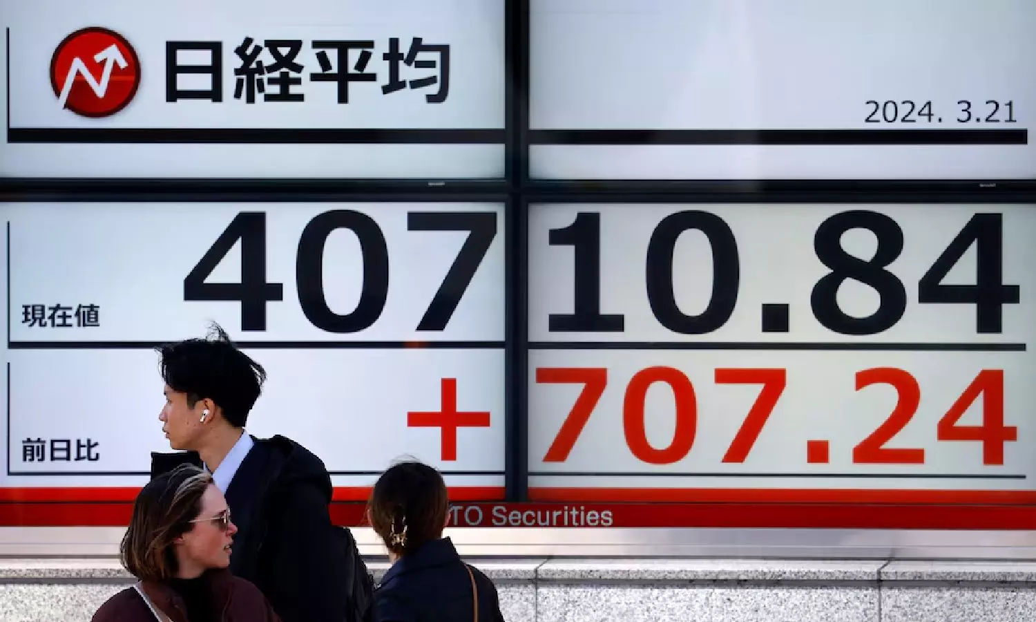 Passersby walk in front of an electric screen displaying Japan's Nikkei share average outside a brokerage in Tokyo