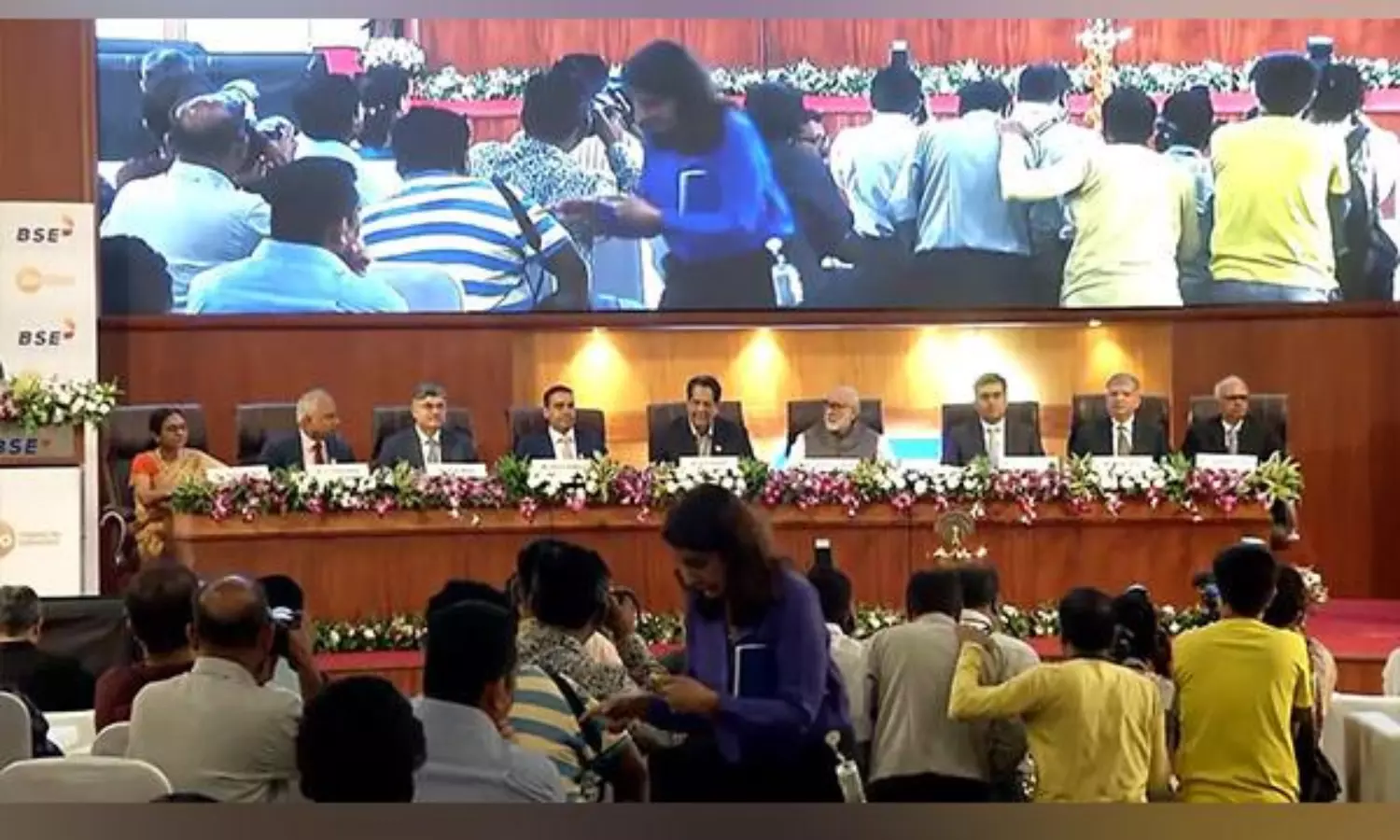 The dignitaries present on the stage included Kamath, BSE Chairman Mundra, Anshuman Thakur (Senior Vice President of Jio Platform Limited), Bimal Tanna (Independent Director), Jagannath Kumar (CEO of Reliance Foundation), Hitesh Setia (CEO and President), Sunil Mehta (CEO of the Indian Banks Association), K Seturaman (President, Group Cooperative Secretarial and Governance of Reliance Industries Ltd), and Jaishree Rajesh.