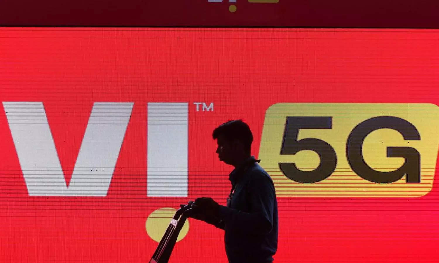 A man walks across the LED display board showing the logo of Vodafone-Idea (Reuters)