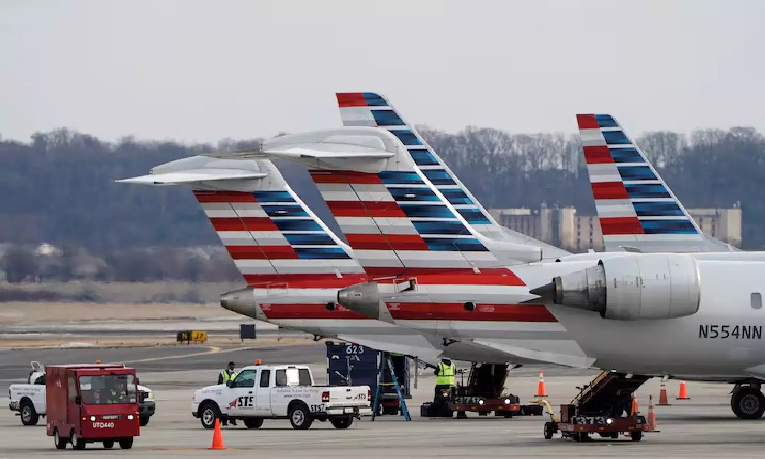 Grounds crews work around American Airlines aircraft at Reagan National Airport in Arlington, Virginia