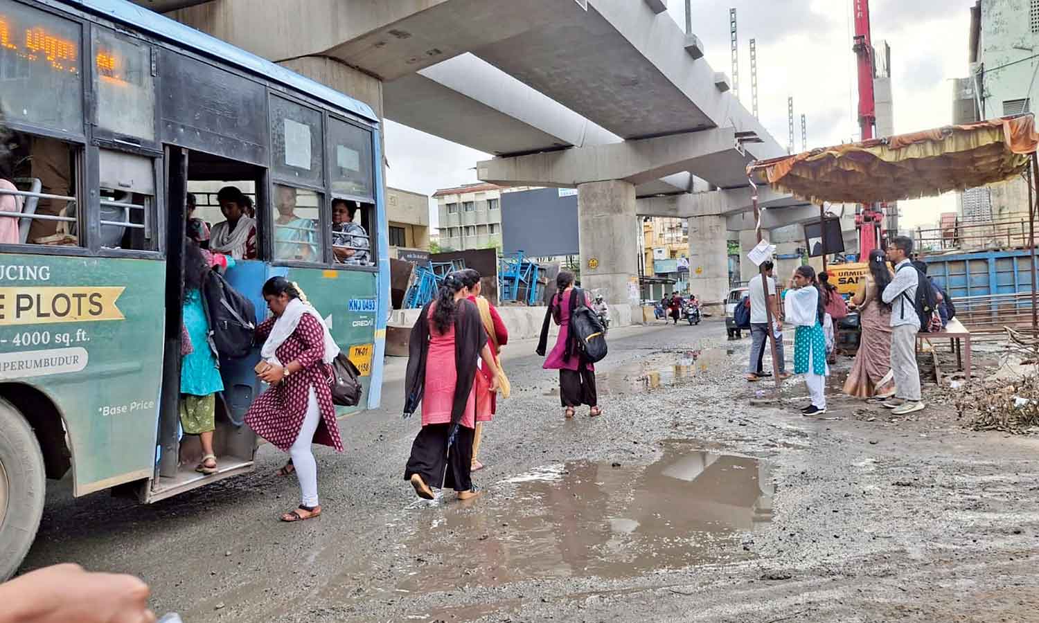 “How are we supposed to walk on this muddy and slippery road? It’s horrible. And the bus stop does not protect us from rain and dust. Sometimes, vehicles splash the muddy water on people waiting at the stop. The government must act immediately,” fumed Silambu Selvi, a regular commuter.