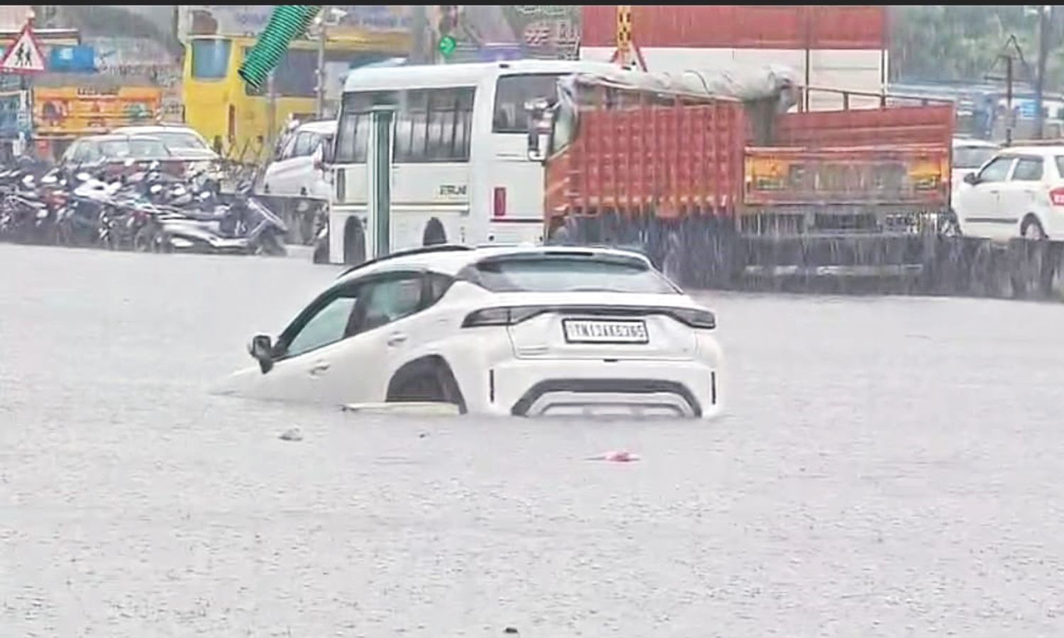 A large tree was uprooted on Greenways Road and crashed onto a moving car, though no injuries were reported. Further west, a floating car on the Poonamallee High Road service lane near Velappanchavadi drew attention on social media, reflecting the extent of waterlogging on the city’s periphery.