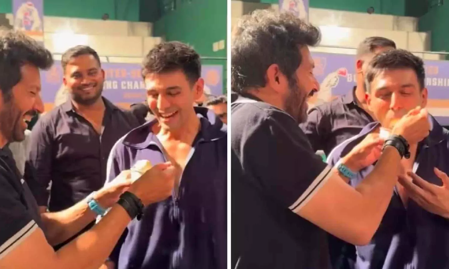 Aaryan, who was on a strict diet for his role of a sports hero in the film, shared a video from the film's wrap party where Khan is seen feeding the actor the rasmalai sweet.
