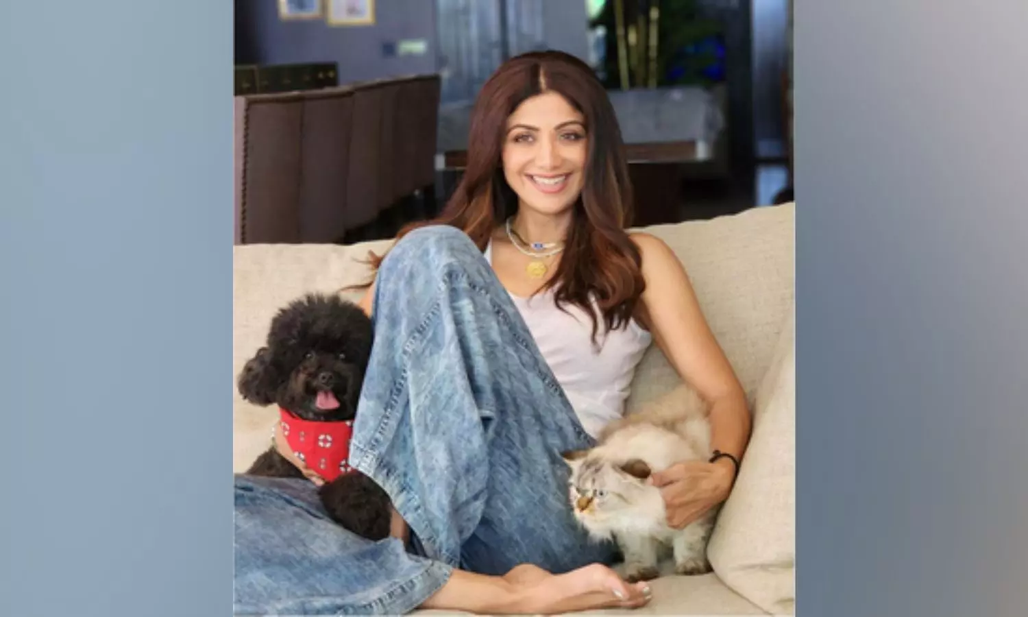 Shilpa is wearing a white tank top and blue flared denims and is cuddling her furry friends.