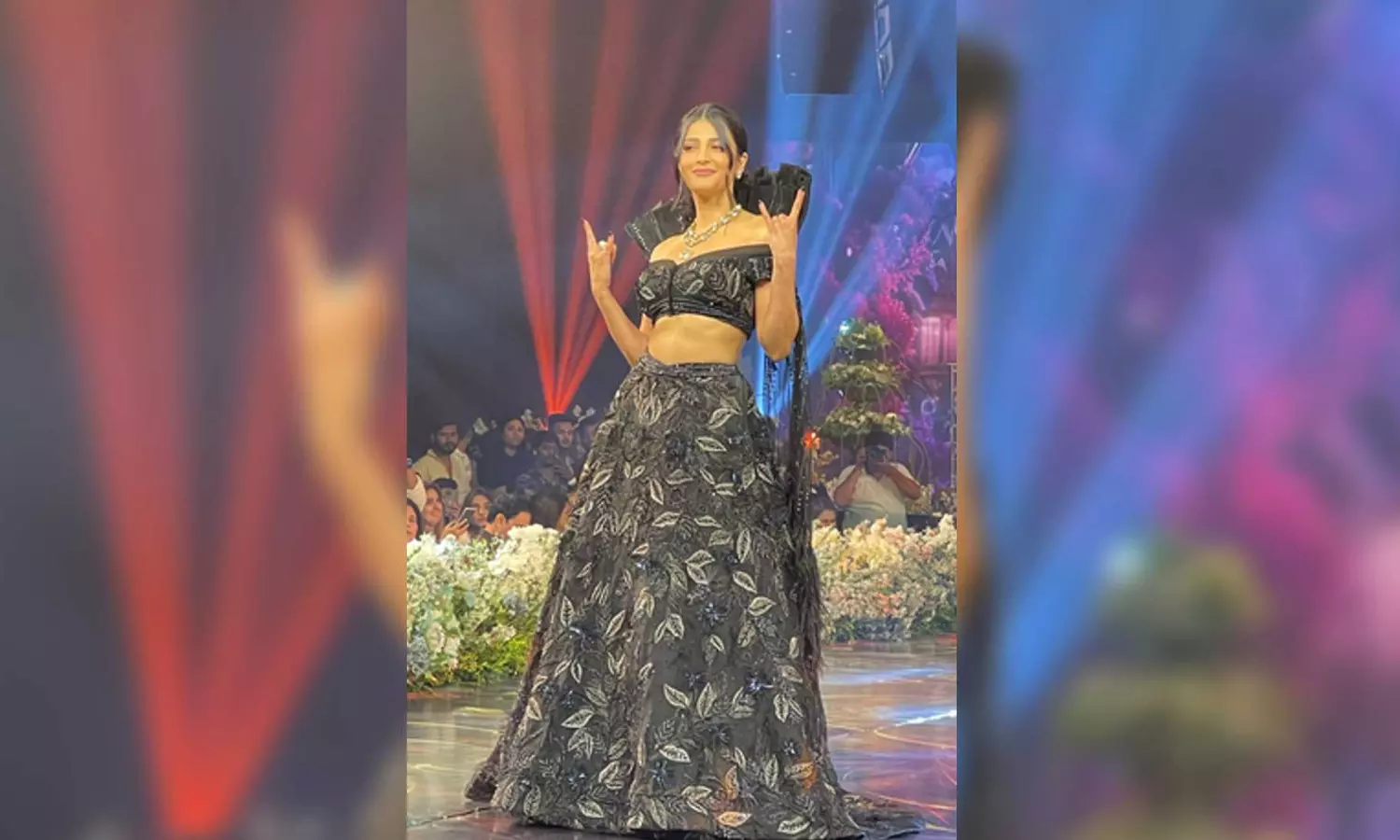 This extravagant event, known for its blend of glamour and social impact saw a host of actors walking the ramp. Shruti glided down the ramp for the fashion show in a black hooded Indo western lehenga by Amit GT.