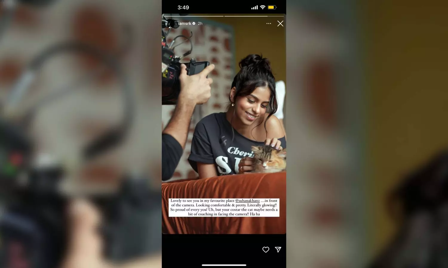 Shah Rukh wrote: "Lovely to see you in my favourite place Suhana Khan...in front of the camera. Looking comfortable and pretty. Literally glowing. So proud of every you! Uh! But your co-star, the cat maybe needs a bit of a coaching in facing the camera. Haha."