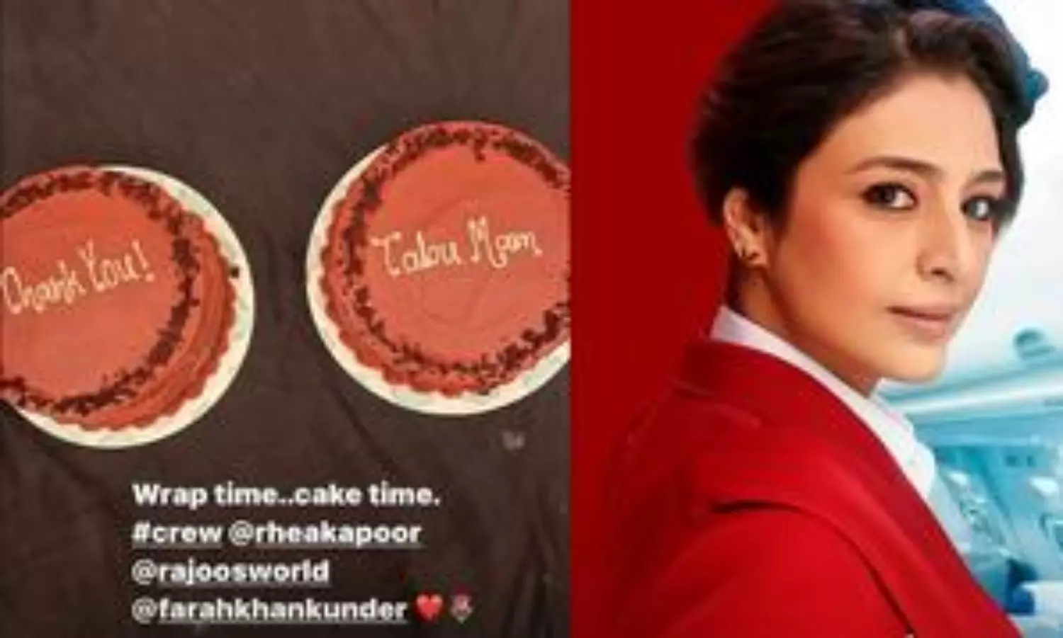 The picture shows 2 celebratory cakes. Tabu wrote on the picture, “Wrap time...cake time #crew @rheakapoor @rajoosworld @farahkhankunder."
