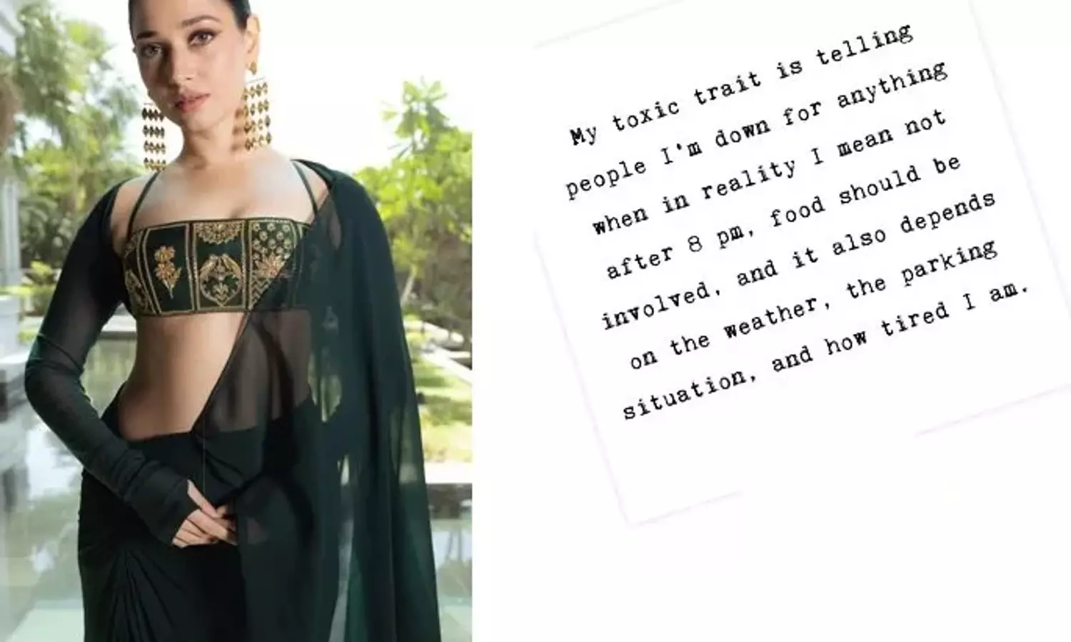 Actress Tamannaah Bhatia has revealed her hilarious toxic trait through a meme, involving food, weather, and parking situations