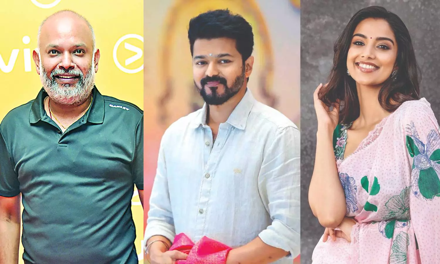 (L to R) Venkat Prabhu, Vijay and Meenakshi Chaudhary.
