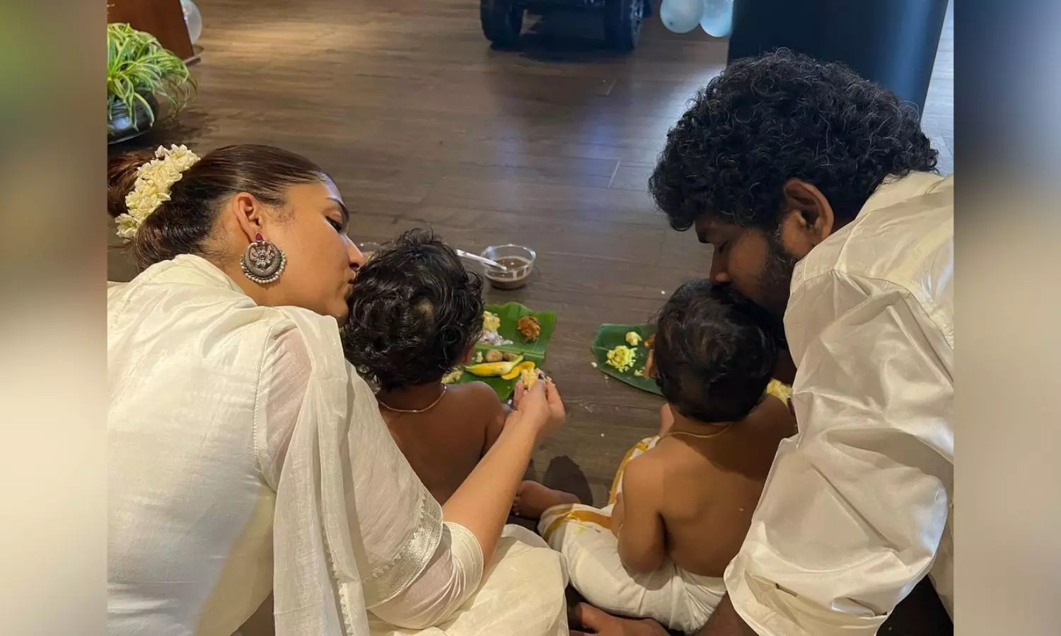 Vignesh shared pictures of him and Nayan with their sons clad in a traditional 'Mundu' seated in front of the 'Sadhya' (Traditional Kerala meal) spread on mini banana leaves.