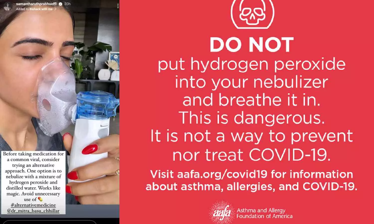 In a recent social media post, Samantha - who has a whopping 35.3 million followers on Instagram alone, put up a post saying using hydrogen peroxide in nebuliser helped her and advised her followers to try that before taking tablets.