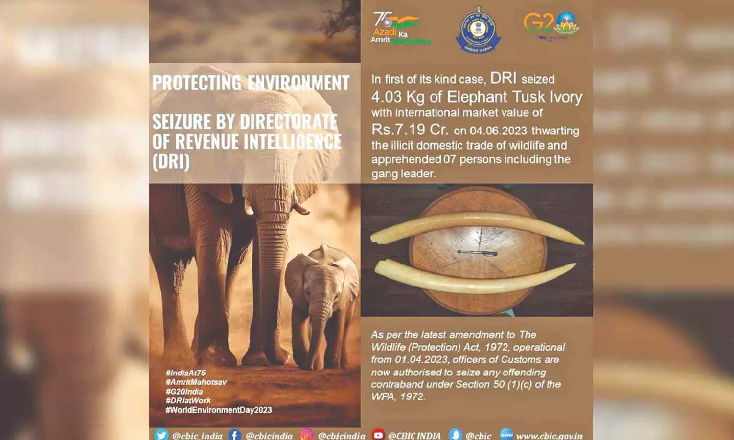 The forest department officials were alerted about the seizure, said officials, adding that the value of the seized tusks was ascertained to be Rs 7.19 crore in the international market. The seized tusks were handed over to the forest department for further investigation.