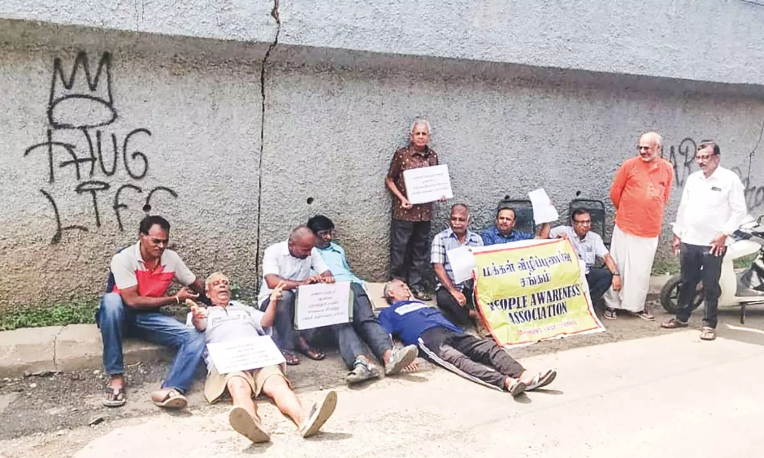 When the activists approached the TNEB about the road, they were told that the electricity board had paid Rs 4.5 crores to the highways department for the repair, which is yet to commence the mending works. The Chromepet People Awareness Association filed a petition with the highways department to repair the service road but did not receive an appropriate response even after many tries. On Saturday, the association members protested by lying on the damaged road and demanded the highways department repair the road immediately.