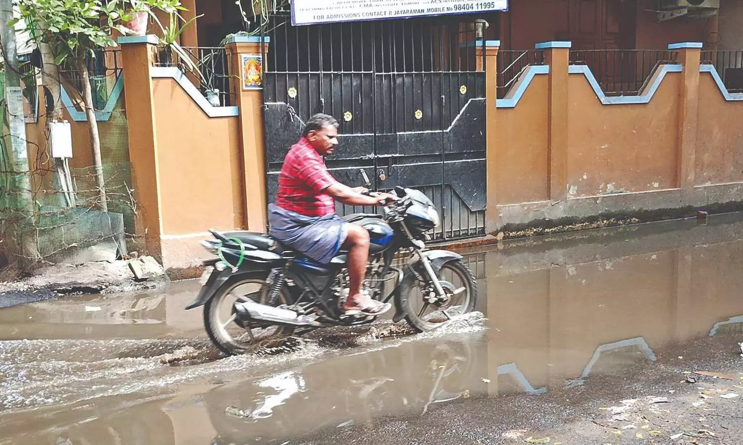 A two-wheeler seen riding through a sewage-logged stretch in Perambur