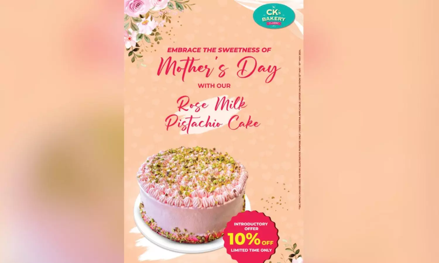 CHENNAI: CK's Bakery has rolled out a new rose milk pistachio cake in honour of Mother's Day. Describing the cake as a delicious mix of the beloved south Indian beverage with the nutty goodness of pistachios, the brand vouches that it will evoke warmth and nostalgia, two qualities associated with maternal bonds, thus making this the perfect dessert to celebrate Mother's Day week with.