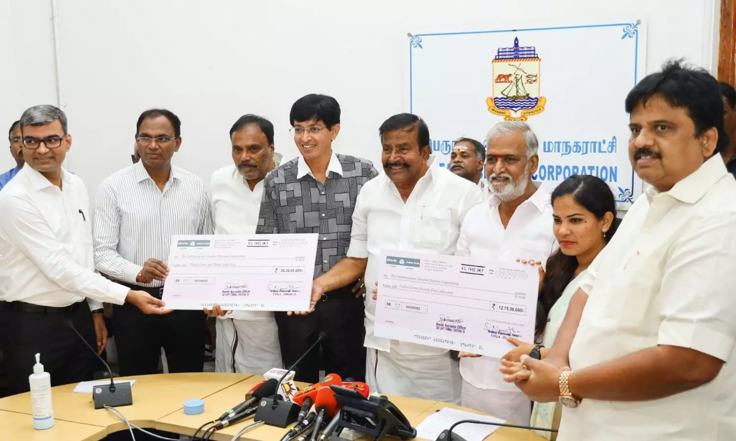 CHENNAI: CMDA and Hindu Religious and Charitable Endowments department minister PK Sekarbabu handed over Rs. 43.05 Crore of CMDA's fund to the Greater Chennai Corporation, on Thursday. KN Nehru, Municipal Administration and Water Supply department minister received the cheque.