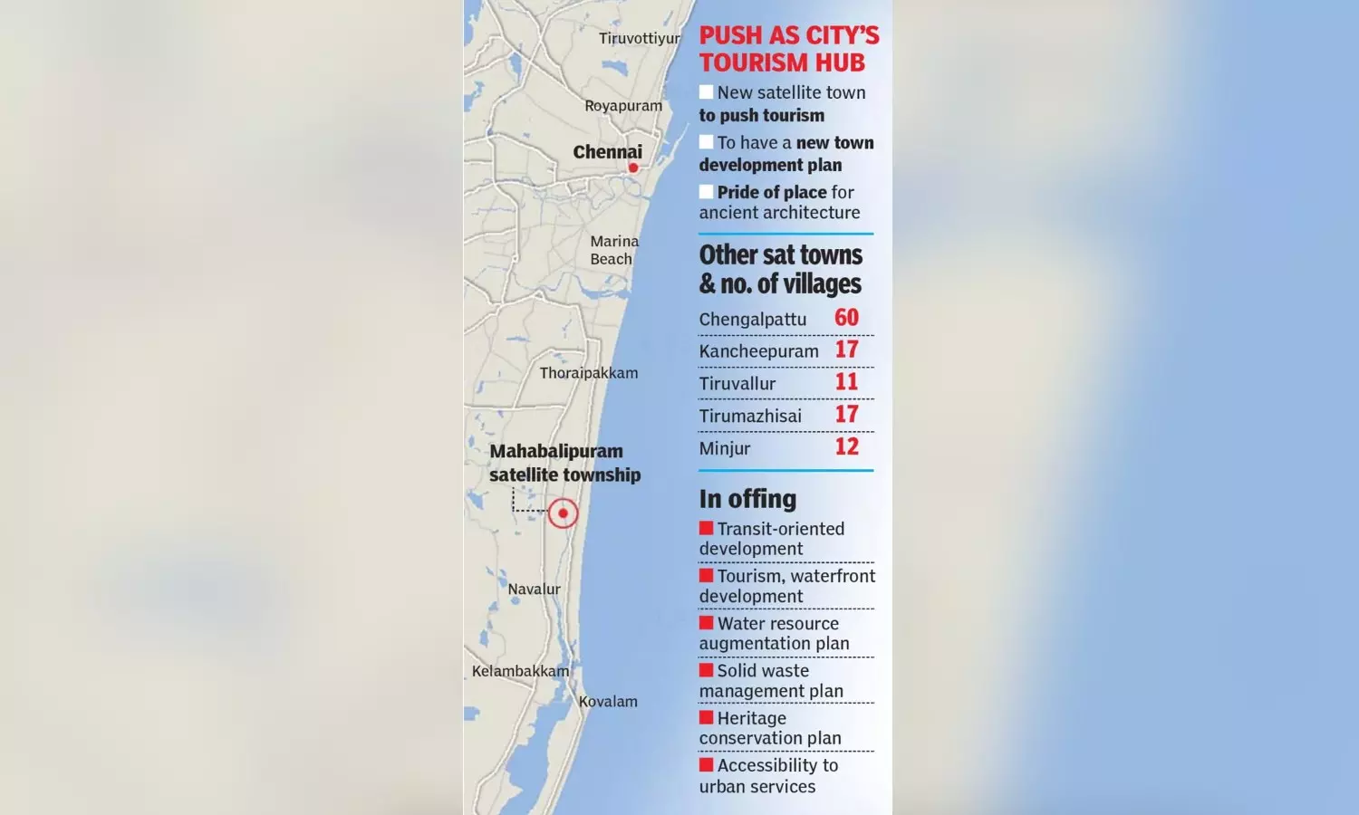 Apart from Mahabalipuram, the government has taken measures to create new towns in Chengalpattu, Kancheepuram, Tiruvallur, Tirumazhisai and Minjur. The new town of Chengalpattu will cover 60 revenue villages and Kancheepuram new town will cover 17 revenue villages. Tiruvallur and Thirumazhisai new towns will cover 11 and 17 revenue villages respectively. As many as 12 revenue villages will be part of the new Minjur town.