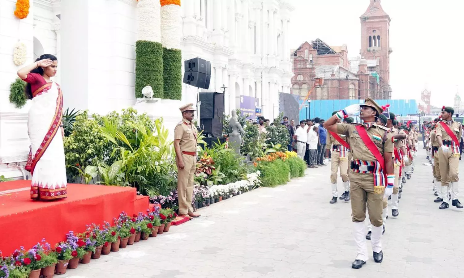 The Mayor accepted the salute from the volunteers of the National Service Scheme and Bharat Scouts and Guides. Following, the students of the Greater Chennai Corporation schools performed cultural performances at the corporation office premises.