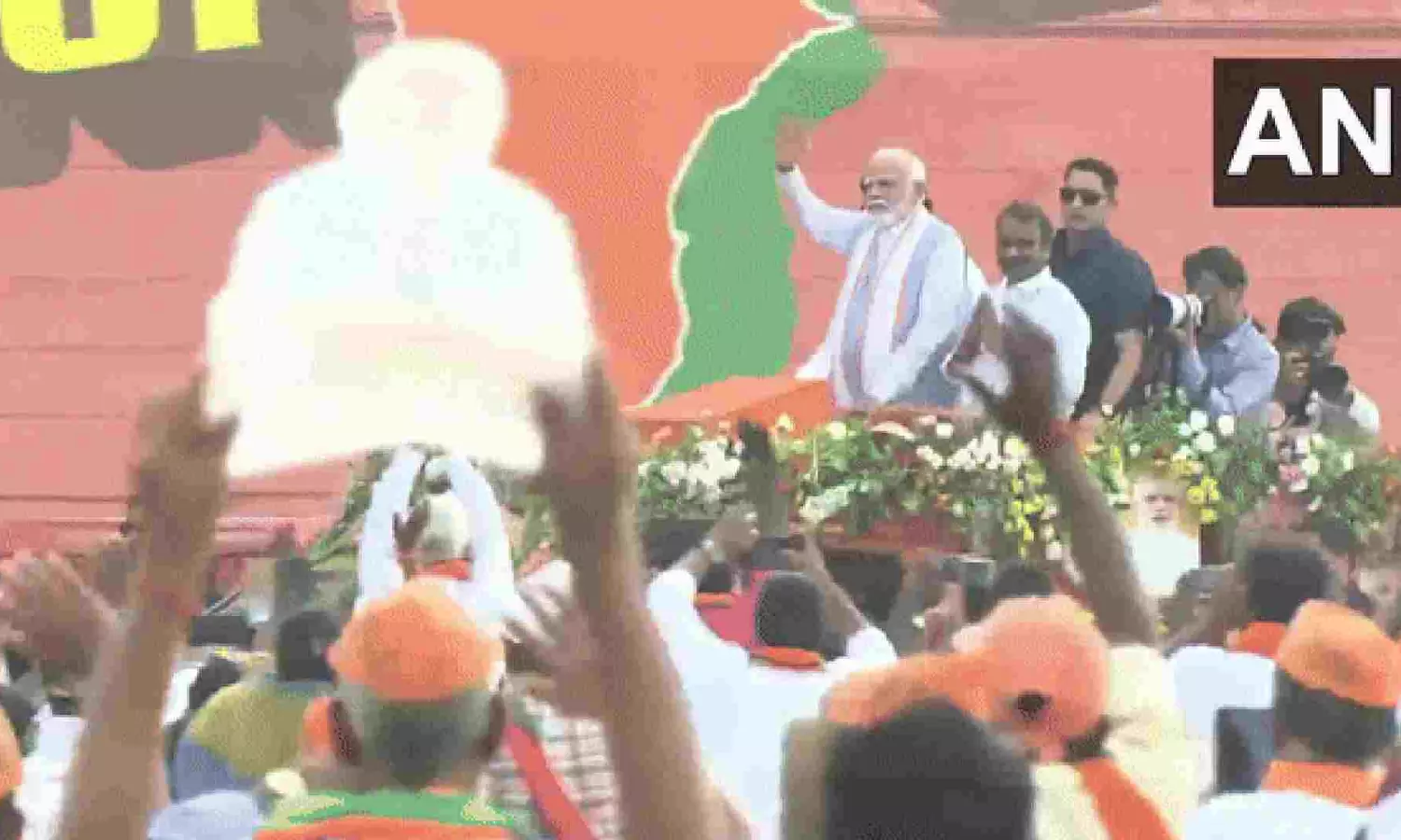 CHENNAI: Prime Minister Narendra Modi on Tuesday arrived at the closing ceremony of the 'En Mann Ek Makkal' padayatra in Tiruppur, Tamil Nadu. PM Modi will participate in the programme 'Creating the Future - Digital Mobility for Automotive MSME Entrepreneurs' in Madurai, Tamil Nadu.