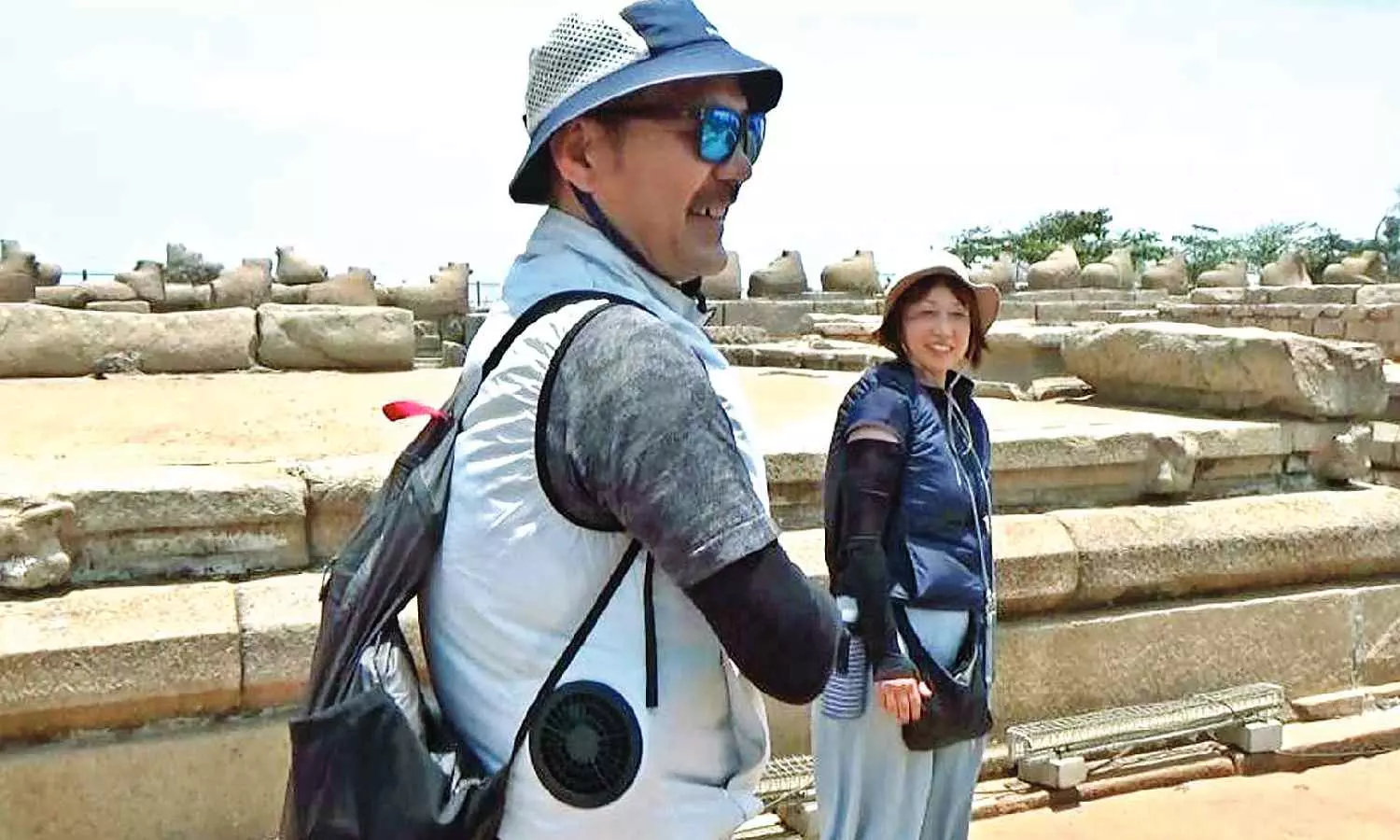 In an innovative way to beat the rising temperature, Japanese couple Izamu (43) and Keito (39), who work in the IT sector, landed in Mahabalipuram wearing air-conditioned puffer jackets which helped them manage the intense weather all the while enjoying the day sightseeing.