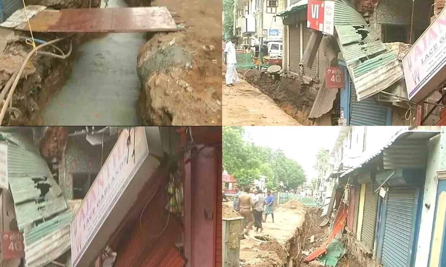 The Chennai Corporation carried out storm water drain works around 3.30 am while using JCB vehicle to dig up the road and collect mud from the drain the shops have been damaged with shutters fallen down and a minor roof collapse has occurred.