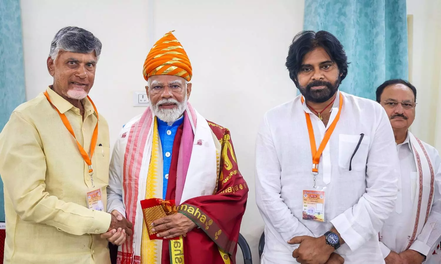 Prime Minister Narendra Modi being greeted by TDP President N Chandrababu Naidu and Jana Sena Party president K Pawan Kalyan (PTI)
