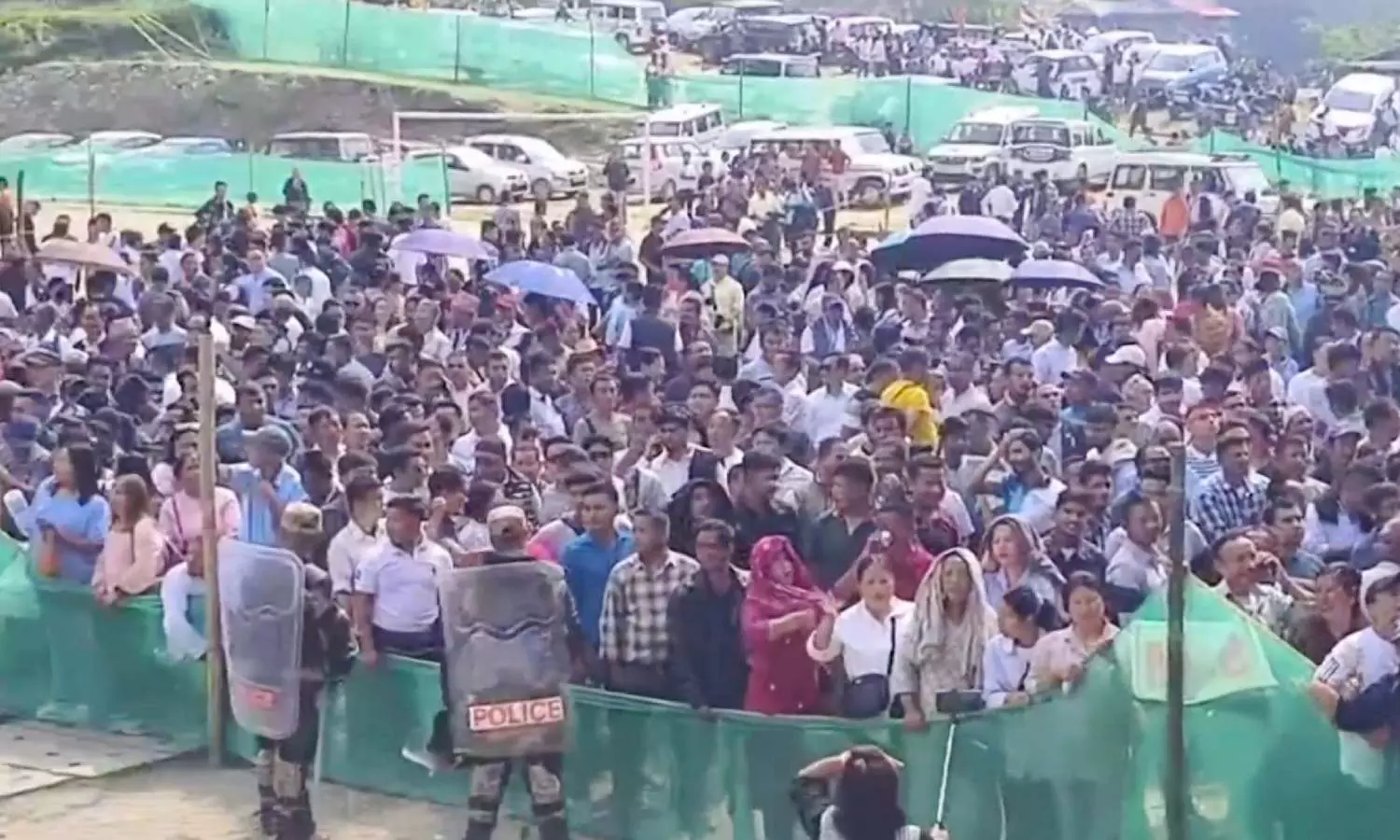 People gather outside a counting centre as Sikkim Krantikari Morcha (SKM) leads in the Assembly polls (PTI)