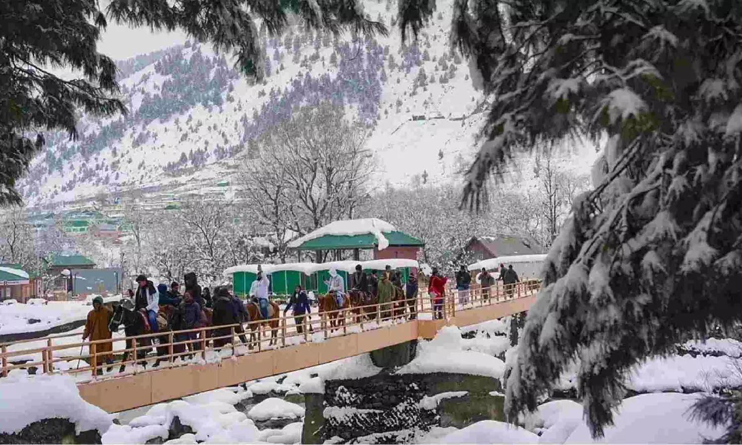Tourists cross a bridge after snowfall at Sonamarg in Ganderbal district, Kashmir (PTI)