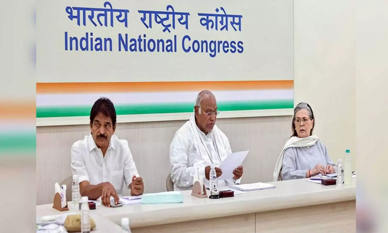 Congres leader KC Venugopal, party president Mallikarjun Kharge and Sonia Gandhi (ANI)