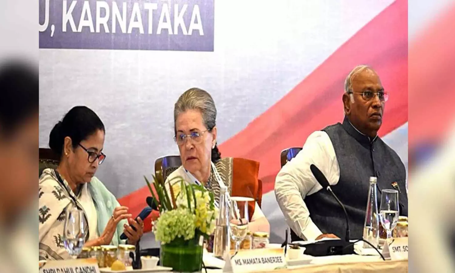 West Bengal Chief Minister Mamata Banerjee, Congress leaders Sonia Gandhi, Mallikarjun Kharge (ANI)