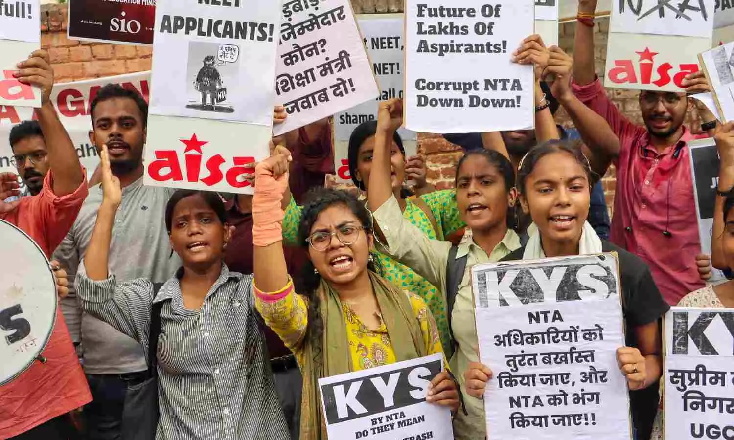 Members of various organisations protest against the National Testing Agency (NTA) over the alleged irregularities in NEET-UG 2024 results (PTI)