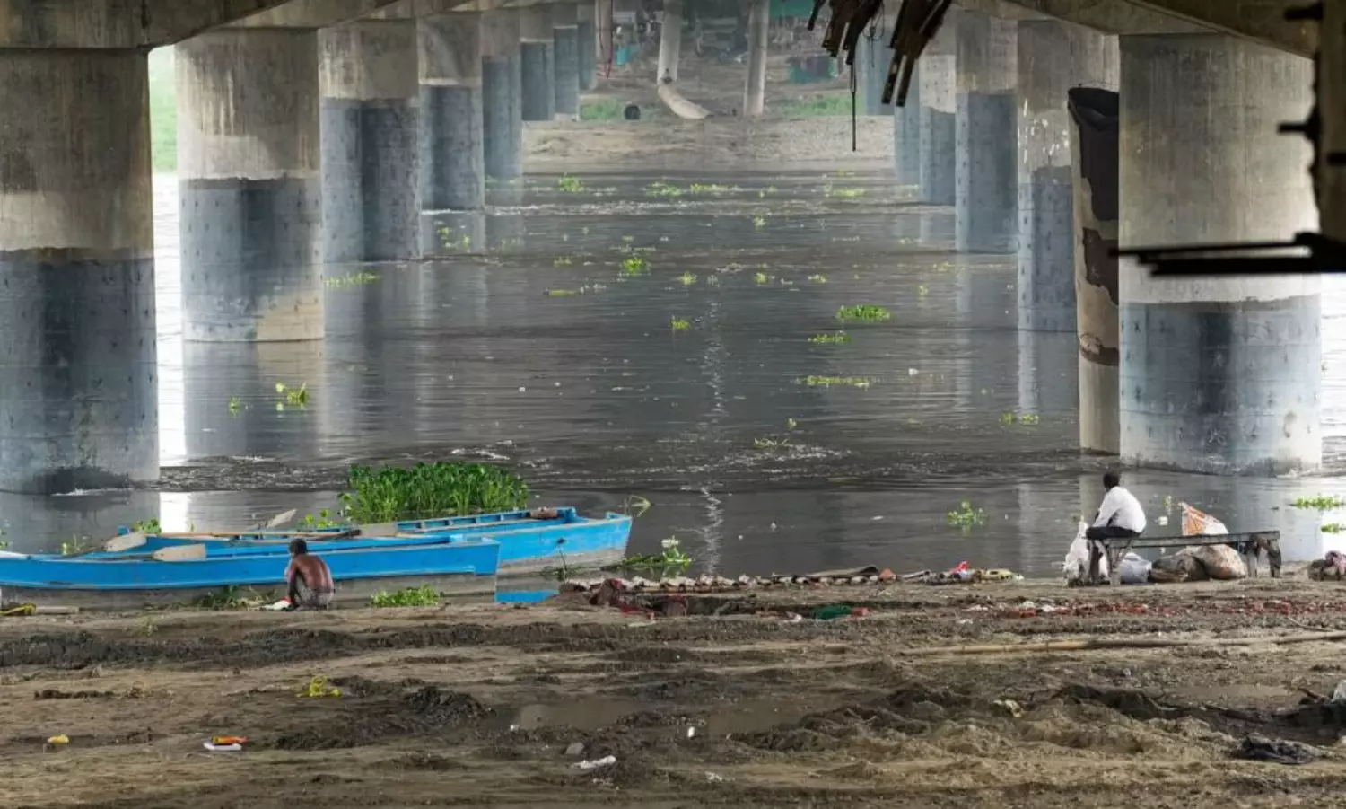 A boat anchored near the bank of Yamuna river, in New Delhi
